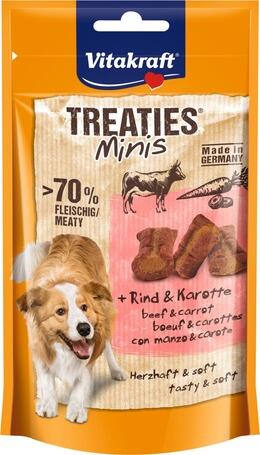 240g Vitakraft Treaties Minis puha, extrán húsos jutifalatkák friss marhahússal és répával kutyáknak. 70%-ot meghaladó hústartalommal. Gyengéden sütve készítik. Természetes antioxidánsokat tartalmaz, amelyek hozzájárulnak a sejtvédelemhez. Egészséges jutalomfalat kutyáknak. Németországban készül.