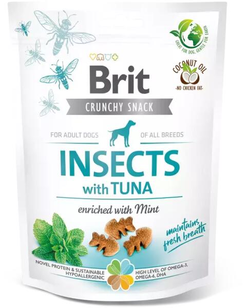 Brit Care Crunchy Cracker Insects with Tuna Ropogós csemege rovarokkal és tonhallal, m entával dúsítva. Hatékony kiegészítő állateledel kutyák számára. Friss lehelletet biztosít Egészséges és ízletes jutalom Rovarfehérje – remekül emészthető, allergiás reakció kockázata alacsony Magas arányú zsírsav-tartalom az egészséges bőrhöz és fényes szőrzethez Újrahaszno