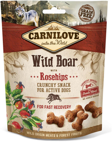A CARNILOVE Crunchy Snack vaddisznóhús csipkebogyóval további jellemzői: gabona- és burgonyamentes friss vaddisznóhúst tartalmaz a csipkebogyó természetes C-vitamin forrás, mely segíti a gyors felépülést. Nem tartalmaz mesterséges ízfokozót és tartósítószert.
