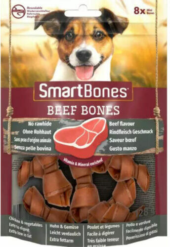 A SmartBones közepes méretű kutyáknak való kutyacsontok nemcsak finom marhahús ízzel kényeztetik kedvencét, hanem kiválóan rágható, hosszan tartó rágásélményt nyújtó textúrájukkal is. A két rágócsont ideális jutalomfalat közepes termetű kutyák számára, a főétkezések közöti időszakra. A SmartBones marha ízű kutyacsontok a legkiválóbb marha, a zöldséges bur
