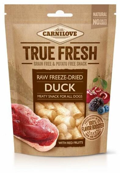 Egyedülálló fagyasztva szárított falatok 90%-ban kacsahúsból. A kíméletes feldolgozási módszer megőrzi a hús eredeti ízét. Használhatók ízfokozóként a napi normál étkezés tetején, vagy ellenállhatatlan jutalomként. A piros gyümölcsök fokozzák a snack csodálatos ízét, és biztosítják, hogy az étkezés izgalmas élmény legyen kutyája számára. Összetétel: kac