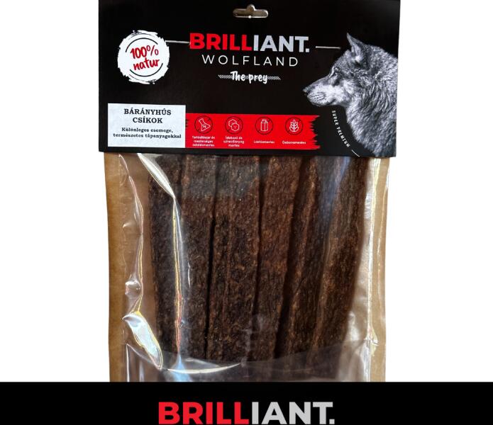 A Brilliant Wolfland jutalomfalatai közül a bárányhús csíkok kíméletes szárítási technológiának köszönhetően, mely szerint mindösszesen 40°C fokos levegő fúvással, a húsok, szervek rendszeres átmozgatásával, 36-48 óra alatt elpárologtataják belőlük a teljes nedvességtartalmat. A szigorúan betartott alacsony hőfokkal történő szárítás hatására az alapanyagok