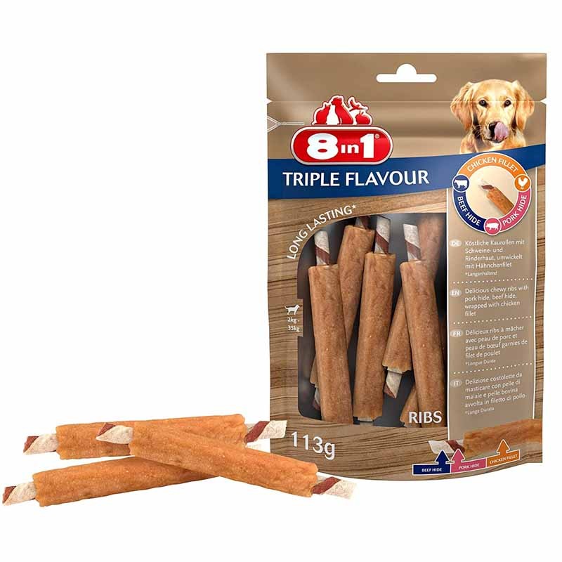 8in1 Triple Flavour Ribs Rágórudak Négylábú barátja imádni fogja a csirkés falatoknak ezt az ínycsiklandó Wings alternatíváját! Ízletes háromrétegű rágócsont csirkehúsfilével gazdagon, sertés- és szarvasmarha bőrre tekerve. 8In1 Triple Flavour Ribs rágórudak előnyei: Ízletes húsos rágócsontok felnőtt kutyák számára. Hosszan tartó rágcsálást biztosító, szaba