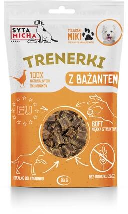 A Syta Micha fácánnal készült tréningcsemege a kiváló minőségű fehérje természetes forrása. A sovány húsok közé sorolt fácánhús olyan elemekben is gazdag, mint a vas, magnézium, réz, kalcium és foszfor, valamint A-vitamin, biotin és niacin. Az ilyen összetétel biztosítja kutyusod megfelelő agyműködését, serkenti az immunitást, és segít megőrizni az egészséges,