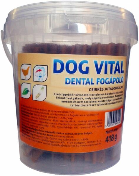 JUTALOMFALAT DOG VITAL VÖDRÖS CSIRKÉS Kiegészítő takarmány felnőtt kutyák számára. A cikóriagyökér kivonat erősíti az immunrendszert és elősegíti a kalcium felszívódását, ami így erősíti a fogakat és a csontozatot. Etetési javaslat: felnőtt kutya számára 1-2 db / nap. Összetevők: kukorica keményítő, állati származékok, növényi származékok, természetes sz