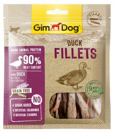 A GimDog Duck Fillets snack egy kiegészítő állateledel kutyáknak. Jellemzők : - Fagyasztva - és levegőn szárított filé darabkák, válogatott kacsából, illatos zöld teával kombinálva. - Gazdagon tartalmaz magas minőségű és jól emészthető fehérjét. - Gabonamentes receptet alapján készült, magas hústartalmú ízletes snack. - Nem tartalmaz hozzáadott cukrot, mestersége