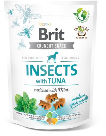 Brit Care Crunchy Cracker Insects with Tuna Ropogós csemege rovarokkal és tonhallal, m entával dúsítva. Hatékony kiegészítő állateledel kutyák számára. Friss lehelletet biztosít Egészséges és ízletes jutalom Rovarfehérje – remekül emészthető, allergiás reakció kockázata alacsony Magas arányú zsírsav-tartalom az egészséges bőrhöz és fényes szőrzethez Újrahaszno