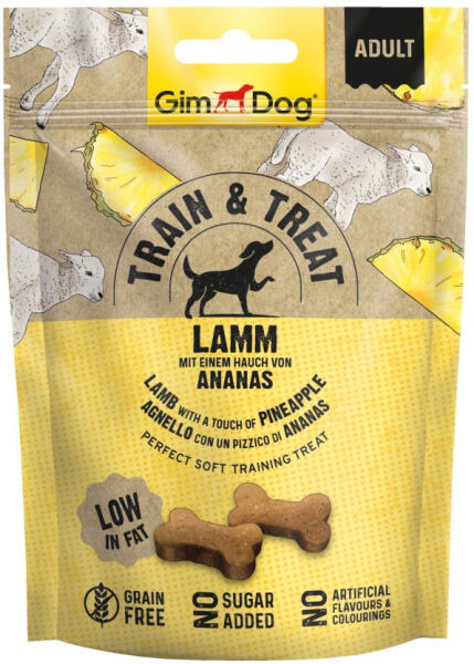 A GimDog Train & Treat Lamm & Ananas snack egy minőségi jutalomfalat báránnyal és ananásszal kutyák részére. Jellemzők : - A GimDog Train & Treat snack ideális kutyák tanítására és jutalmazására. - Az ananásszal finomított bárány értékes és alternatív fehérjeforrása egyedülálló és fantasztikus íze elvarázsolja kutyáját. - A recept gabonamentes, hozz