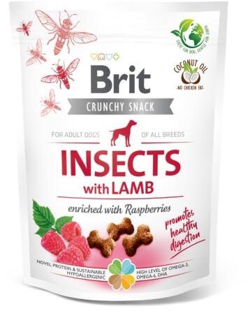 Brit Care Crunchy Cracker Insects with Lamb Ropogós csemege rovarokkal és bárányhússal, málnával dúsítva . Hatékony kiegészítő állateledel kutyák számára. Az egészséges emésztés támogatásához Egészséges és ízletes jutalom Rovarfehérje – remekül emészthető, allergiás reakció kockázata alacsony Magas arányú zsírsav-tartalom az egészséges bőrhöz és fényes