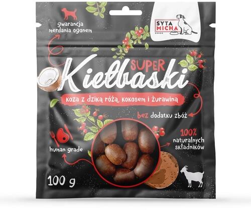 SUPER kolbászok kecskével „A kutyák ehetnek kolbászt? Igen, mert a Syta Micha SUPER kolbászai 100%-ban természetes finomságok minden szőrös házi kedvenc számára. Olyan ropogós rágcsálnivalók, mint még soha, 95%-ban tiszta kecskehúsból és szuperélelmiszer-kiegészítőkből – vadrózsa, áfonya és kókuszdió – áll. Nem tartalmaznak glicerint, tartósítószert vagy má