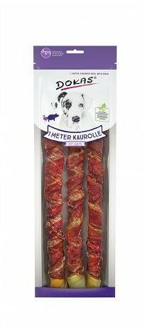 DOKAS Kacsahúsos rágótekercs 1M Egészséges rágcsálnivaló, közepes- és nagytestű kutyák számára . Marhabőr betekerve kacsahússal. Remek rágcsálnivaló. Allergiára hajlamos kutyáknak is ideális választás lehet . 1M hosszú. Összetétel: marhabör 76%, kacsamell 22%, növényi melléktermékek, ásványi anyagok Analitikai összetevők: nyersfehérje 81,9%, nyerszsírok 8,3%,