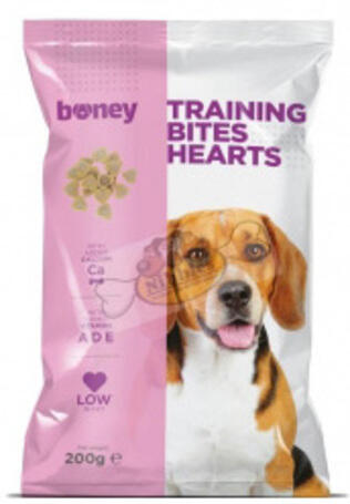 1kg A Boney Training Bites Hearts szívecske alakú jutalomfalatkák alacsony zsírtartalmú rágókák kutyák részére. A cikóriagyökér kivonat erősíti az immunrendszert és elősegíti a kalcium felszívódását, ami így erősíti a fogakat és a csontozatot.