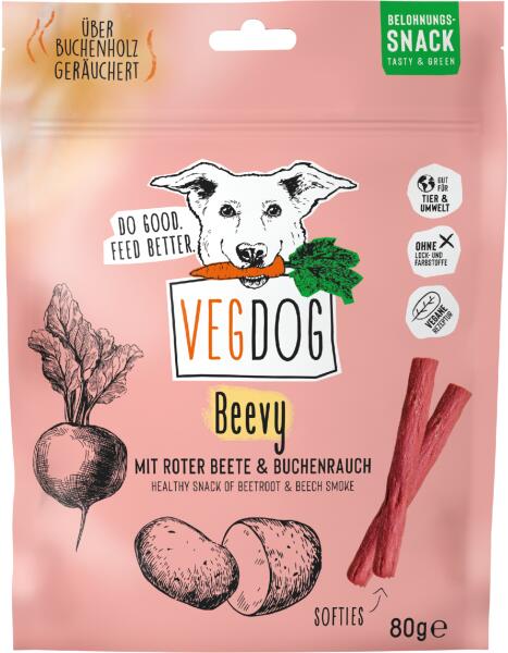 Vegán csemege kutyáknak Hipoallergén receptúra Bükkfa felett füstölt Céklával Attraktánsoktól és színezékektől mentes Németországban előállítva
