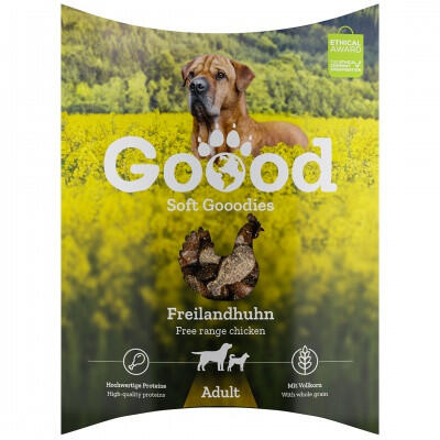 Puha jutalomfalat felnőtt kutyáknak. Puha jutalomfalat felnőtt kutyáknak. Jellemzők : Szabadon tartott csirke Kiváló minőségű fehérjével. Segíti az emésztést és az anyagcserét Puha Gooodies jutalmfalataink hús vagy hal, bajor zöldségek és a Goood létfontosságú összetevőinek kiegyensúlyozott egyvelege. A csomagolás újrahasznosítható, a tartalom pedig 100%-ban klímase