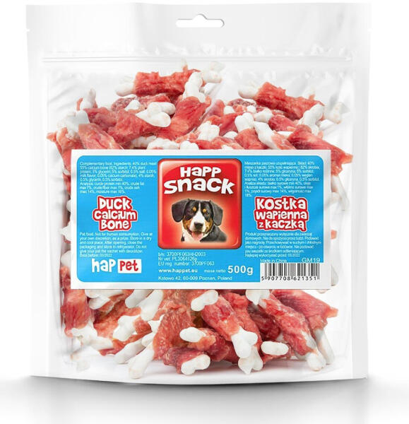 Nettó tömeg: 500g Összetétel: 40% kacsahús, 55% mészkő (82% keményítő, 7,4% növényi fehérje, 5% glicerin, 5% szorbit, 0,5% só, 0,005% tejaroma, 0,05% kalcium-karbonát), 4,5% keményítő , 0,5% glicerin, 0,5% szorbit Analitikai összetétel: nyers fehérje min. 40%, nyers olajok és zsírok min. 1%, nyersrost max. 1%, nyers hamu max. 14%, páratartalom max. 18%. Kacsa kalciumcsontra