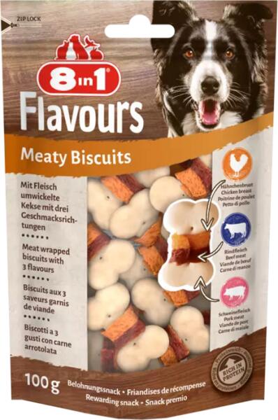 Az 8in1 Flavours Meaty Biscuits húsos kekszek három finom ízt egyesítenek egyetlen jutalomfalatban!A finom sertéshússal ízesített ropogós kekszek ízletes csirkemellbe és marhahúsba vannak beletekerve. A kutyák megőrülnek ezért az izgalmas ízélményért. A kekszek fehérjében gazdagok, és nem tartalmaznak ízfokozókat, GMO-kat, sem mesterséges tartósítószereket. Ráadásul