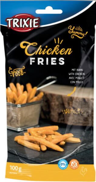 Trixie Chicken Fries - jutalomfalat (csirke) kutyák részére (100g) Ízletes csirkefalatok Összetétel: csirkehús (34%), rizsliszt, borsókeményítő, glicerin, tápióka keményítő, ásványi anyagok, édesburgonya liszt, tojás és tojástermékek, lenmagolaj, rozmaring