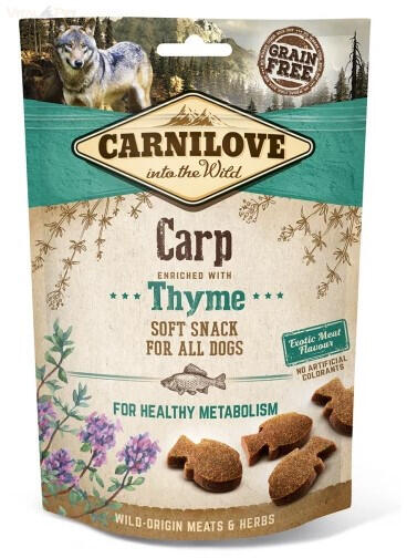 Egzotikus húsíz! Ízletes, puha falatkák minden kutyának kakukkfűvel az egészséges anyagcseréért. Kiegészítő állateledel kutyáknak. Összetétel: 35% szárított ponty, sárgaborsó, folyékony növényi keményítő, lazachúslé, szárnyasmájból készült húslé, kollagén, 1% kakukkfű, lazacolaj. Adagolási útmutató: közepesen nedves falatkákból álló kiegészítő álla