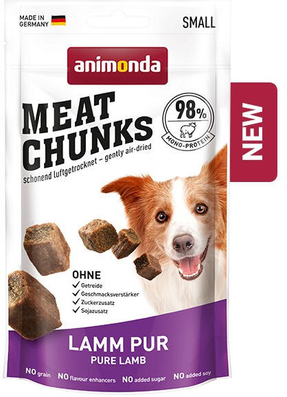 Animonda Meat Chunks Lamm Pur bárányszínhús jutalomfalat. Kizárólag bárányhúst tartalmazó, hipoallergén, monoprotein, puha, illatos jutalomfalat darabok elsősorban kistestű kutyáknak ajánlva. Az Animonda Meat Chunks puha színhús jutalomfalatok ellenállhatatlanul finomak. Ezek a húsos kutya snackek csak egy állati fehérjeforrást tartalmaznak, és nem tartalmaznak gabonát. Eny