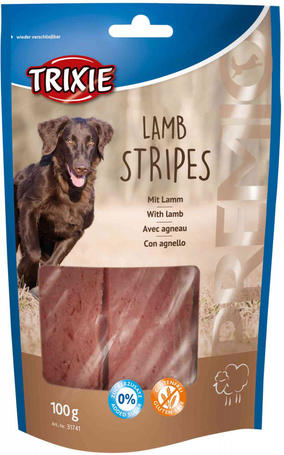 300g Trixie Premio Lamb Stripes, azaz bárányhús lapok kutyáknak. Ez egy gabona- és gluténmentes jutalomfalat, amely cukor hozzáadása nélkül készül. Proteinben gazdag, 90%-os hústartalom. 100 grammos visszazárható csomagolásban kapható. Német minőség.