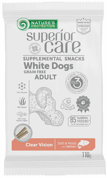 A Nature’s Protection Superior Care Adult Fehér Kutyáknak CLEAR VISION jutalomfalat további jellemzői: Hipoallergén : fő fehérjeforrása a lazac, mely könnyen emészthető és tökéletes a testsúlykontrollhoz T ear stains off formula : A gondosan válogatott összetevők és a megfelelő kiegyensúlyozott formula megőrzi a könny és a nyál tiszta összetételét, amely segíthet elt