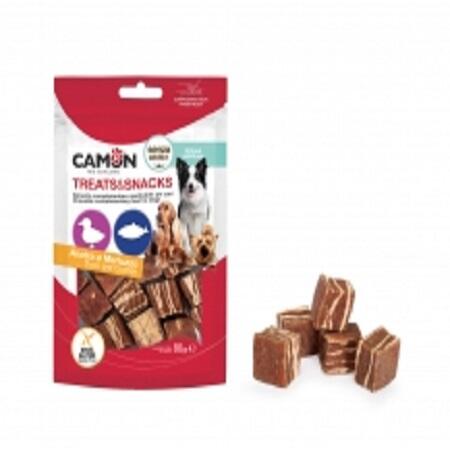 Háromféle húsból összeállított jutalomfalat, kiváló fehérjeforrás kedvencének. Kacsát , csirkét és tőkehalat tartalmaz. Ezekkel a gluénmentes falatokkal jutalmazhatunk munka közben, játékban vagy csak szeretetből. Összetevők: tőkehal (22 %), csirkehús, kacsahús, glicerin, rizs, kukoricakeményítő, borsófehérje, sárgarépa, sütőtök Adagolás: naponta jutalomként a
