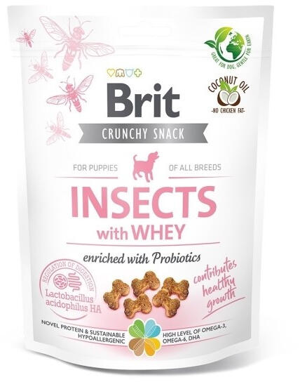 Brit Care Dog Puppy Insects with Whey & Probiotics funkcionális csemegék rovarfehérjével, tejsavóval és probiotikumokkal kölyökkutyáknak. Alacsony allergiakockázat, növekedés és fejlődés támogatása és tökéletes íz. Sok fehérjét, alacsony zsírtartalmat biztosít, és támogatja a fejlődést és az emésztést. Ropogós finomság minden napra. Legfontosabb előnyök: rov