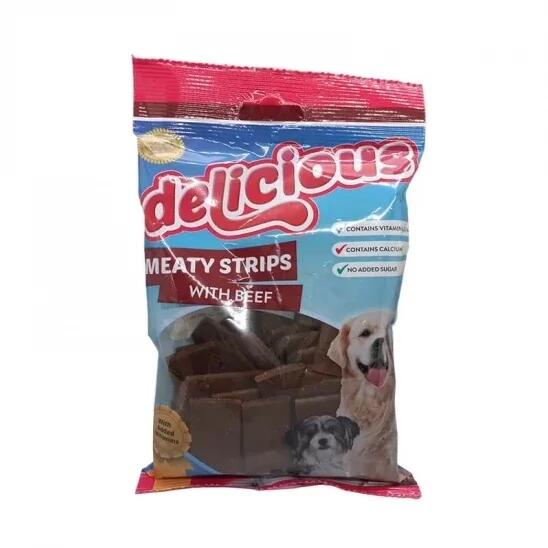 Delicious Meaty strips with beef 200g Kiegészítő takarmány felnőtt kutyák számára. Etetési javaslat: felnőtt kutya számára mérettől függően 1-8 db / nap. Összetevők: válogatott gabonafélék, hús és állati melléktermékek, növényi származékok. Tápértékkel rendelkező adalékanyagok (/kg): Vitamin A 5000 IU, Vitamin D3 500 IU, Vitamin E 50 mg, kálcium karbonát 1000mg