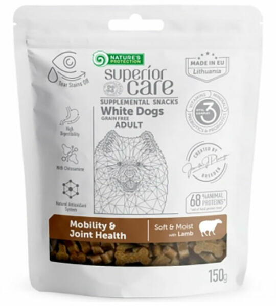 A Nature’s Protection Superior Care Adult Fehér Kutyáknak JOINT jutalomfalat további jellemzői: Hipoallergén : fő fehérjeforrása a bárány, mely könnyen emészthető és tökéletes a testsúlykontrollhoz Kit ozamin, glükózamin és kondroitin tartalma támogatja a kutyák csípőjének és ízületeinek rugalmasságát és egészségét, segítve mozgékonyságukat és általános í