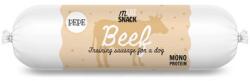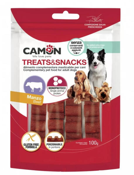 Monoproteines, marha ízesítésű adagolható snack. Nettó mennyiség 100g. Étrendkiegészítő kutyák részére. Összetétel: marhahús 82%, szójafehérje koncentrátum, kukorica keményítő, szorbit, (zöldség) glicerin, nátrium-klorid, cirok. Analitikai alkotóelemek: nyersfehérje: 35,42% - nyers rostok: 0,9% - nyers zsír: 6,7% - nyers hamu: 2,6% - Nedvesség: 21,4%. Használati utas