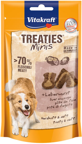 A zooplus. hu kínálatából: Kicsi, szaftos és extra húsos: a májkrémes Vitakraft Treaties Bits Mini kiváló ízzel és étvágygerjesztő textúrával kényezteti kedvencét, s kiváló jutalomfalatnak ígérkezik tréningekhez is. . A kutyasnack ízletes kenőmájassal készül, kímélő módon, kemencében. Különösképp alkalmas kisebb kutyáknak, mert azok is be tudják kapni a kics