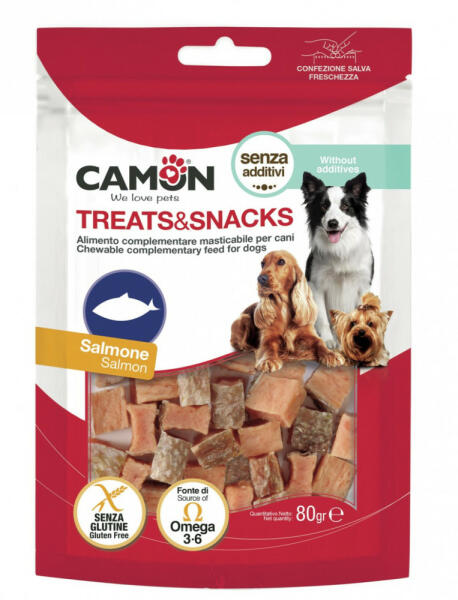 Ízletes lazacos kockák - Glutén, és adalékanyagoktól mentes Omega 3-6 tartalmazó étrendkiegészítő jutalomfalat kutyák számára. Összetétel: lazac 88,5% lazac, kukoricakeményítő, glicerin, szorbit, só. Analitikai összetevők: nyers fehérje 40%, nyersrost 3 %, nyers olajok és zsírok 5 %, nyers hamu 5 %, nedvességtartalom 18%. Felhasználás: 4 hónapnál fiatalabb kutyák sz