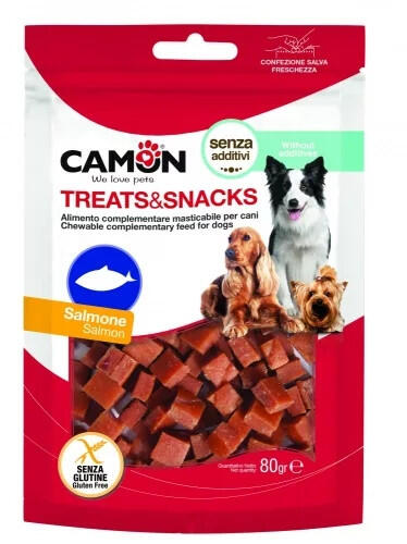 Ízletes lazacos kockák 1 x 1 x 0,5 cm. Glutén, és adalékanyagoktól mentes jutalomfalat kutyák számára. Nettó 80 gramm. Összetétel: lazac 91%, borsófehérje, kukoricakeményítő, glicerin, szorbitol. Használati útmutató: 4 hónapnál fiatalabb kutyák számára nem ajánlott. Ajánlott napi fogyasztási mennyiség: 1-20 db (1db 0,52 gr), az eb mérete alapján határozza meg a menn