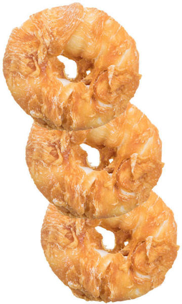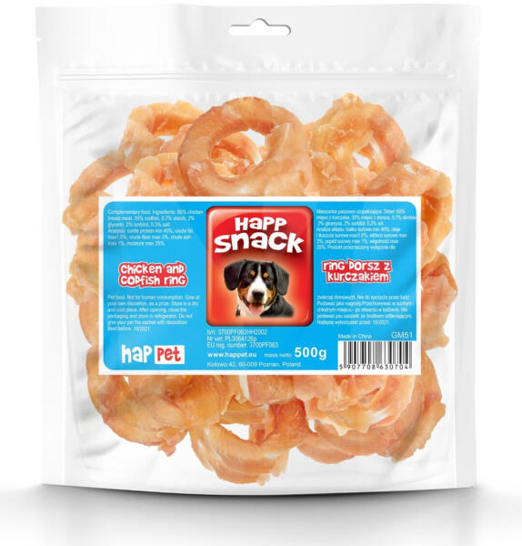 Nettó tömeg: 500g Összetevők: 60% csirkehús, 35% tőkehal, 0,7% keményítő, 2% glicerin, 2% szorbit, 0,3% só Analitikai összetétel: nyers fehérje min. 40%, nyers olajok és zsírok min. 1,5%, nyersrost max. 3%, nyers hamu max. 1%, páratartalom max. 25%. Csirke és tőkehal gyűrű A csirke és tőkehal húskarikája igazi csemege minden fajtájú felnőtt kutyának. Interesting shape a