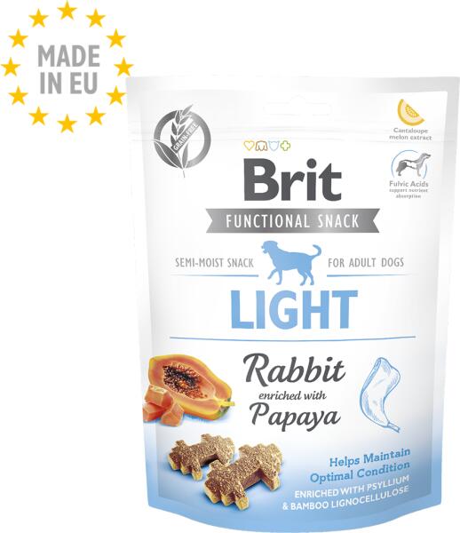 Brit Care Snack Dog Functional Light Rabbit – Funkcionális jutalomfalatok gabonafélék nélkül felnőtt, túlsúlyos kutyák számára. Olyan rostforrásokat tartalmaz, melyek segítenek megtartani az ideális testsúlyt - útifű és bambusz lignocellulóz. Nyúlhús az alacsony zsírtartalmú fehérjék forrása Az alacsony kalóriatartalmú papaya oldhatatlan rostok kiváló forrása, mely