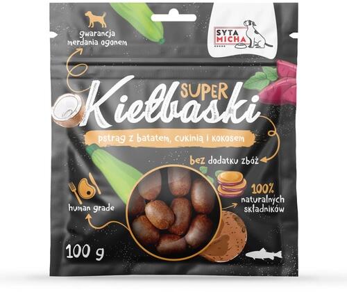 SUPER kolbász pisztránggal „A kutyák ehetnek kolbászt? Igen, mert a Syta Micha SUPER kolbászai 100%-ban természetes finomságok minden szőrös házi kedvenc számára. Olyan ropogós rágcsálnivalók, mint még soha, 95%-ban tiszta pisztráng izomhúsból és szuperélelmiszer-kiegészítőkből – édesburgonya, cukkini és kókuszdió – áll. Nem tartalmaznak glicerint, tartósító