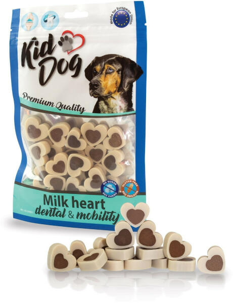 KidDog Milk Heart Dental&Mobility pompás ízű, tejes jutalomfalat kutyák számára. Remek motivációs csemege. Tréningezéshez is kitűnő választás. Nem tartalmaz glutént és hozzáadott cukrot. Kiegészítő eledelként adható ízletes finomság, mely hozzájárul a csontok, porcok és ízületek egészségének fenntartásához. Összetétel: 10% tej, 60% kukoricakeményítő, 15%