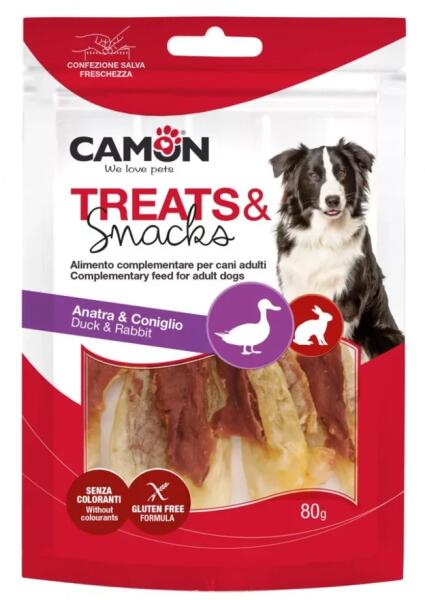 Nyúlfül kacsával 80 gramm - Glutén és színezékmentes étrendkiegészítő felnőtt kutyák részére. Összetétel: kacsahús 77%, szárított nyúlfül 15%, burgonyakeményítő, glicerin (növényi), földimogyoró, szorbit, borsófehérje, fehérjekoncentrátum (szójamag), nátrium-klorid. Adalékanyagok: tartósítószerek. Analitikai összetevők: Nyersfehérje 32,16% - Nyersrostok 1,