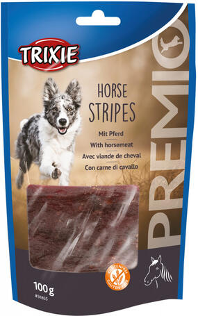 400g A Trixie Premio Horse Stripes 86% lóhúst tartalmazó jutalomfalat. Gluténmentes. Visszazárható csomagolása révén sokáig frissen tartható.