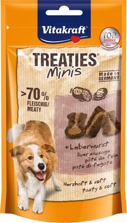 240g Vitakraft Treaties Minis puha, extrán húsos jutifalatkák májjal kutyáknak. 70%-ot meghaladó hústartalommal. Gyengéden sütve készítik. Természetes antioxidánsokat tartalmaz, amelyek hozzájárulnak a sejtvédelemhez. Egészséges jutalomfalat kutyáknak. Németországban készül.