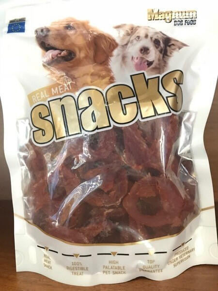 Puha, natúr húscsemege kacsaizomból, karikákat formázva, amelyek könnyen kisebb darabokra oszthatók. 100%-ban természetes kiváló hús. Jutalomként szolgál játék, edzés közben vagy étrend-kiegészítőként utazáskor. Nem terhelik a szervezetet, kiválóan emészthetők. A fogakra és az ínyre gyakorolt ?negatív hatás nélkül. A csomagolás tetején egy zárható cipzár talá