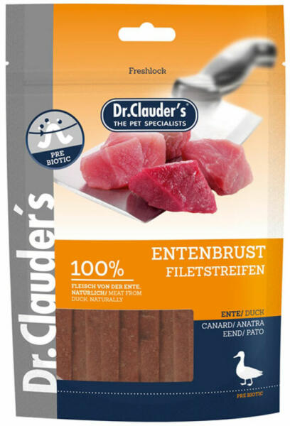 Dr. Clauder's Dog jutalomfalat kacsafilé csíkok egy ínycsiklandó és természetes jutalomfalat kutyák számára. Kizárólag kacsa filéből készülnek, így kiváló minőségű és könnyen emészthetőek. A kíméletes gyártási folyamatnak köszönhetően a csíkok megőrzik a kacsahús természetes ízét és tápértékét. Ezáltal kutyád nem csak ízletes falatokban részesül, han