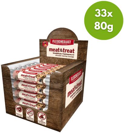 Összetétel : 65% marhahús (máj, hús, tüdő, vese, szív), 8% burgonyakeményítő, 8% répapép, 4% durumbúza daraAnalitikai összetevők: Nyersfehérje: 12,9%, nyers zsír: 5,9%, nyershamu: 2,2%, nyersrost: 6,0%, nedvességtartalom: 62,1%513 kJ / 100 g (123 kcal) Kiszerelés: 33x80 g A meat & trEat jutalomfalatok nem helyettesítik a teljes értékű táplálkozást!