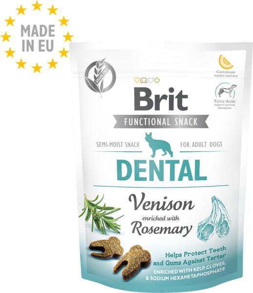 Brit Care Snack Dog Functional Dental Venison – Funkcionális jutalomfalatok felnőtt kutyák számára gabonafélék nélkül, fog-és ínyápoló hatással. Összetevők: Szárított szarvas (26%), sütőtök (20%), vörös lencse (16%), növényi eredetű folyékony keményítő (14%), hidrolizált szarvas fehérje (8%), hidrolizált szarvas lé (5%), hidrolizált kollagén (4%), szárított