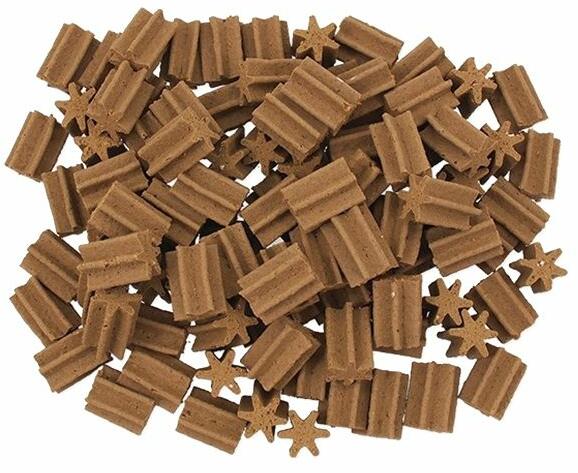 Jutalomfalat kutyáknak. Összetétel: Gabona, glükóz, olajok és zsírok, ásványi anyagok, hús és állati melléktermékek Analitikai összetevők: nyersfehérje: 9,6%, nyersolajok és zsírok: 4,7%, nyersrost: 1,0%, nyershamu: 4,8% Az állandó minőségirányítás és a rendszeres állat-egészségügyi ellenőrzések garantálják a kutyakekszek különleges minőségét és emészthet