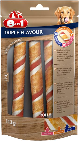 Az ízletes rágcsálnivalókat mindenki szereti, ezért egy finom alternatívát alkottunk, amelyet négylábú barátja biztosan élvezni fog! Ízletes, csábító rágcsálnivaló sertés- és marhabőrből, ínycsiklandó csirkehús-filével töltve. 2 – 35 kg közötti testsúlyú kutyáknak ajánlott. Legfontosabb előnyök: -Ízletes rágcsálnivaló tekercsek sertés- és marhabőrből,