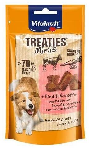 Az extra húsos Treaties® Mini-k különösen kicsik, így ideálisak tréningezéshez vagy kistestű kutyák kényeztetésére. A marhahússal és sárgarépával töltött finom falatok puha, húsos csemegék négylábú barátodnak. Ellenállhatatlanul finomak és különösen lédúsak . Tökéletes jutalmazásra! Kiadós, húsos mini falatok, tökéletes edzéshez Ideális kistestű kutyák