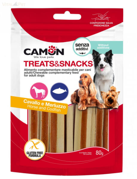 Tőkehalas lovas szendvics 80 g/zacskó Adalék és gluténmentes értendkiegészítő kutyák számára ÖSSZETÉTEL: lóhús 70%, állat melléktermékek (ló) 10%, hal (tőkehal) 10%, szójafehérje koncentrátum, (növényi) glicerin, szorbit, nátrium-klorid. ANALITIKAI ÖSSZETEVŐK: Nyersfehérje 35,3% - Nyersrost 1,0% - Nyerszsír 1,5% - Nyershamu 4,5% - Nedvesség 17,5%. HASZNÁLATI UTASÍ