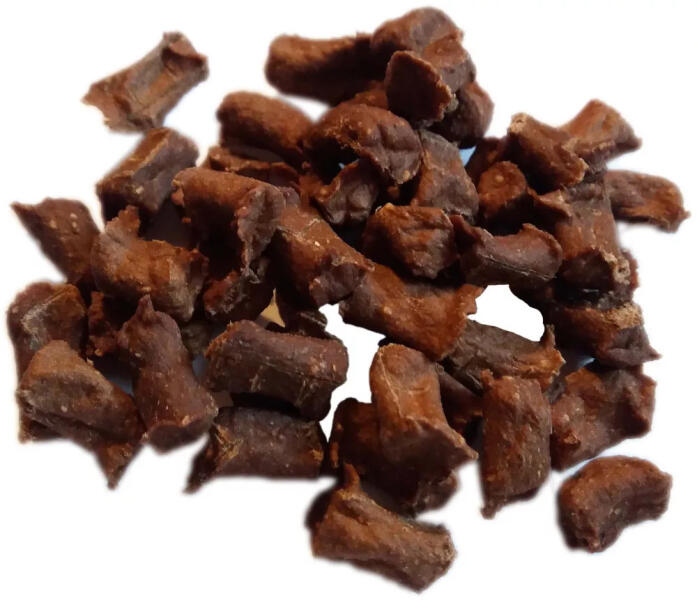 Ízletes kacsa snack tréninghez, gyors jutalmazáshoz, vagy csak egy kis kényeztetéshez. Kicsi falatkák (kb. 1 cm), nem zsíroznak, így könnyedén behelyezhetőek a zsebbe a képzés alatt. 98% hús ból állnak, kizárólag temészetes alma nyersrost, mint kötőanyag egészíti k. 100%-ban természetes és minden adalékanyagtól mentes. Összetevők: Nyersfehérje: 53,3%, Nyerszsír: 29,8