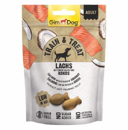 Jellemzők: – A GimDog Train & Treat snack ideális kutyák tanítására és jutalmazására. – A kókusszal finomított lazac értékes és alternatív fehérjeforrása egyedülálló és fantasztikus íze elvarázsolja kutyáját. – A recept gabonamentes, hozzáadott cukrok, színezékek és mesterséges aromák nélkül. – Alacsony zsírtartalmú. Használat: A snack egészben is a